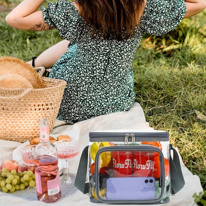 FlowFly Insulated Reusable Lunch Bag Adult Large Lunch Box for Women and Men with Adjustable Shoulder Strap,Front Zipper Pocket and Dual Large Mesh Side Pockets,Clear#Grey