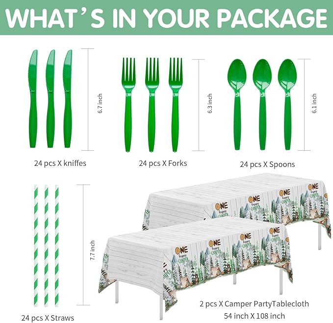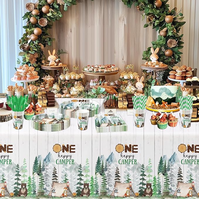 - 【Save Time】These camping theme party supplies for one-year-old birthday are perfect for your party. The disposable one happy camper party tableware and tablecloth can save you from the hassle of cleaning after the party, and you can enjoy more time with friends and family at this party