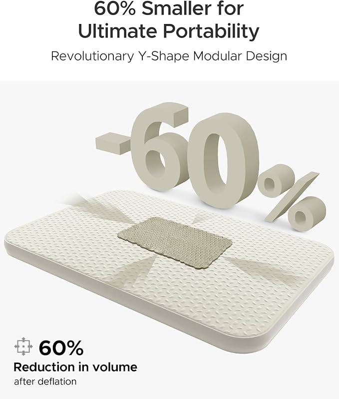 - 𝗜𝗻𝗻𝗼𝘃𝗮𝘁𝗶𝘃𝗲 𝗨𝗹𝘁𝗿𝗮-𝗽𝗼𝗿𝘁𝗮𝗯𝗹𝗲 𝗗𝗲𝘀𝗶𝗴𝗻: Our camping mattress features a Y-shaped foam telescopic structure that reduces its volume by 60% after deflation. As it deflates, it naturally forms a crease in the middle, facilitating easier rolling up. These designs ensure it's lighter and more compact than traditional foam air mattresses