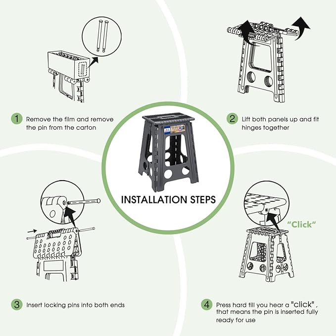 - 【Proper Use and Customer Serve】The plastic step stool must be used on a dry and flat surface.Ensure that the stool is fully open before use and that you hear the Pins fixing "Click" sound.Don't stand on the edget of the stool with one foot or tiptoe.Don't move stools while in use.Our warranty is 3 months with proper use.Customer service Available 24/7.If the pins lost unexpectedly, please do not hesitate to contact us for a replacement.