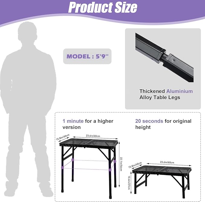 - 【Adjustable Grill Table】Simply connect the rubber tubes to adjust the height from 10.7 inches to 22.5 inches, making it suitable for both standing and sitting while grilling.