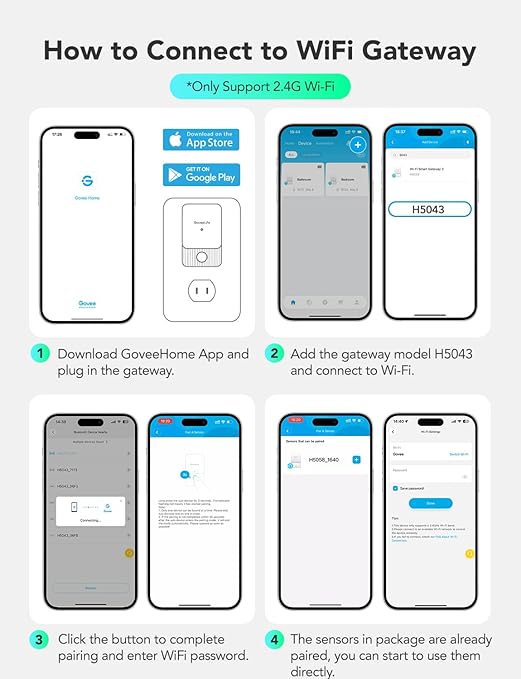 - Smart WiFi Temperature Sensor: With the included sensor, you can easily monitor temperature and humidity data in real time from anywhere with the APP. WiFi gateway supports pairing up to 30 sensors to extend your monitoring range to any location indoors and outdoors.(not support 5G WiFi)