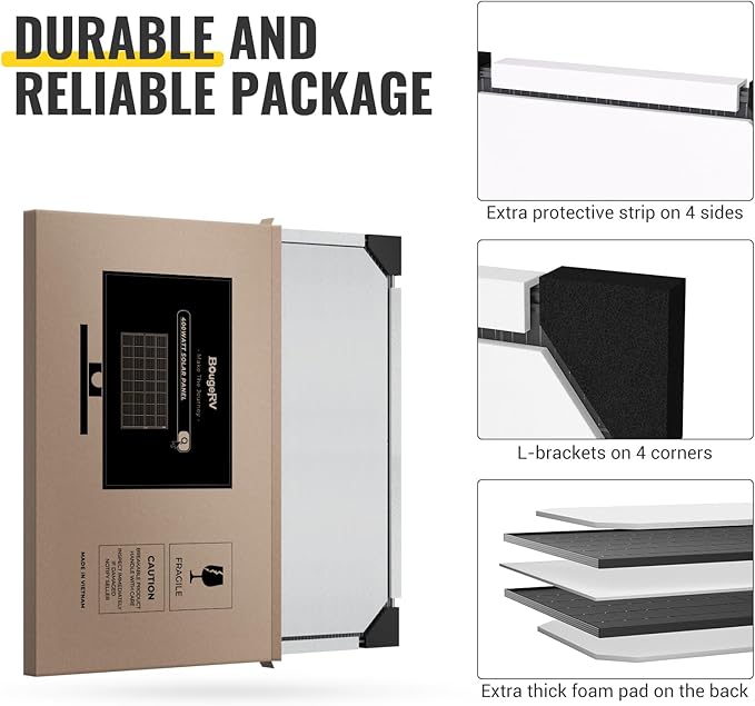 - Durable & Long Lasting. BougeRV sturdy Bifacial 400-watt solar panels can withstand high wind (2400 Pa) and snow loads (5400 Pa) and have excellent performance in low-light environments. Corrosion-resistant aluminum material can withstand the changing outdoor environment and prolong its service life.