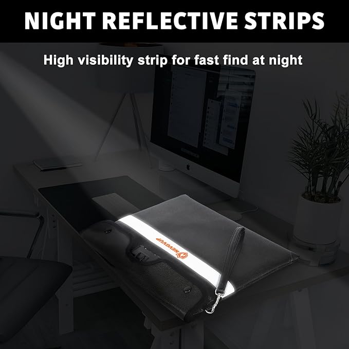 - 6200°F TOP FIRE PROTECTION: Upgraded fireproof bag with lock has passed Global Flammability Standards (US labs) and Vertical Combustion Testing (SGS UL94 V-1); Recommended by professional firefighters and tested in the most demanding environments; The Upgraded fireproof money bag can withstand ultra high temperatures up to 6200°F; It is worth mentioning that the reflective strip of Hand-Carry fire proof bag has high visibility at night, which is convenient for you to quickly find in a fire