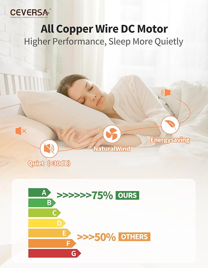 - 【Noiseless Reversible DC Motor】Ceversa low profile DC ceiling fan with light use solid copper wires, which have superior conductivity compared to traditional AC motors. This enhances motor efficiency by over 50%, significantly reducing energy consumption and saving on electricity bills. With noise levels below 30 decibels, our motors are designed to last for over 15 years. Quiet ceiling fan for sleep and work.