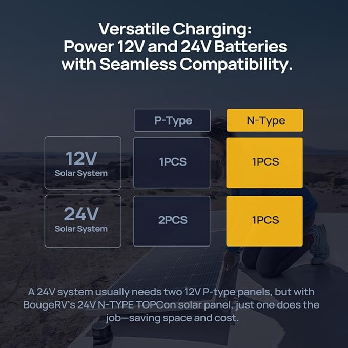 - Bifacial Design Increases the solar output by 30%. Instead of having an opaque back, BougeRV bifacial solar panels feature a transparent backside, allowing it to absorb solar energy from both sides, such as direct sunlight, refracted sunlight, and diffuse sunlight. N-type solar cells have an 80% bifacial gain while P-TYPE have only a 70% bifacial gain.