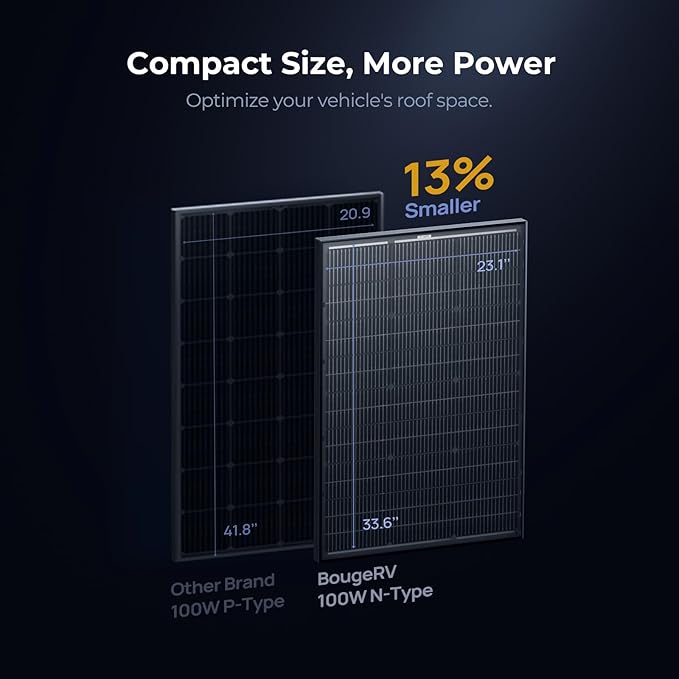 - Compatibility and Wide Usage. Compatible with on-grid and off-grid inverters, the BougeRV N-TYPE 100W solar panel is suitable for powering the house or outdoor use. Corrosion-resistant aluminum material can withstand the changing outdoor environment and prolong its service life. It is easy to use and mount (pre-drilled holes on the back of the panel), and sophisticated to use with your RVs, boats, and other outdoor equipment. Besides, it is suitable for charging golf cart lithium batteries.