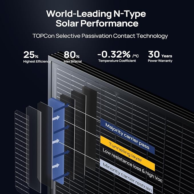 - Bifacial Design Increases the solar output by 30%. Instead of having an opaque back, BougeRV bifacial solar panels feature a transparent backside, allowing it to absorb solar energy from both sides, such as direct sunlight, refracted sunlight, and diffuse sunlight. N-type solar cells have an 80% bifacial gain while P-TYPE have only a 70% bifacial gain.