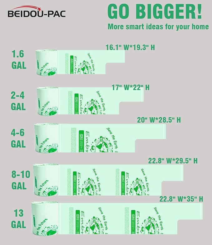 - [KITCHEN COMPOST BIN COMPATIBLE] -- BEIDOU-PAC Compostable Bags, 8-10 gallon 22.8" X 29.5" x 0.75 mils, 60 Count (Pack of 1), home compostable and biodegradable are compatible with a backyard compost system. Our recyclable garbage bags can perfect for 8, 9, 10 gallon under-the-sink kitchen trash can.