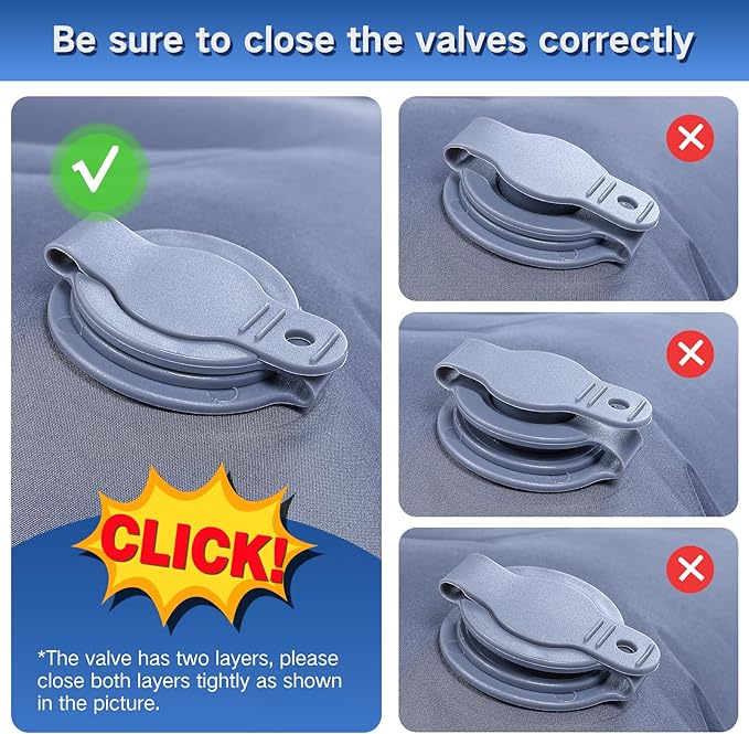 - Note:We have 2 double-layered valves on the one-piece pillow of the sleeping pad. Please close the valves tightly, and check the valves first if you find any leaking.