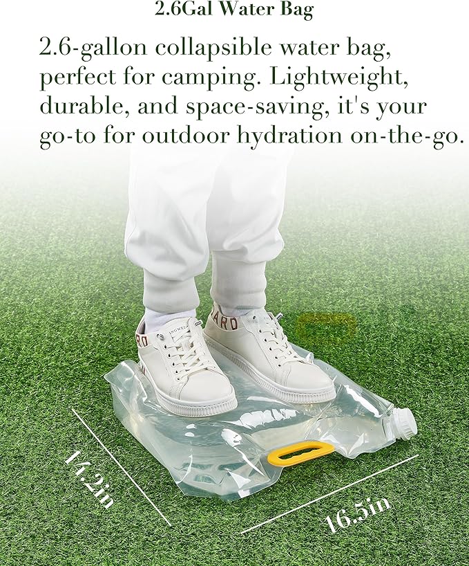 - Quantity and Composition: The set consists of two water containers: a 5-gallon water jug and two 2.6-gallon collapsible water bags. This ensures ample water storage for outdoor activities.