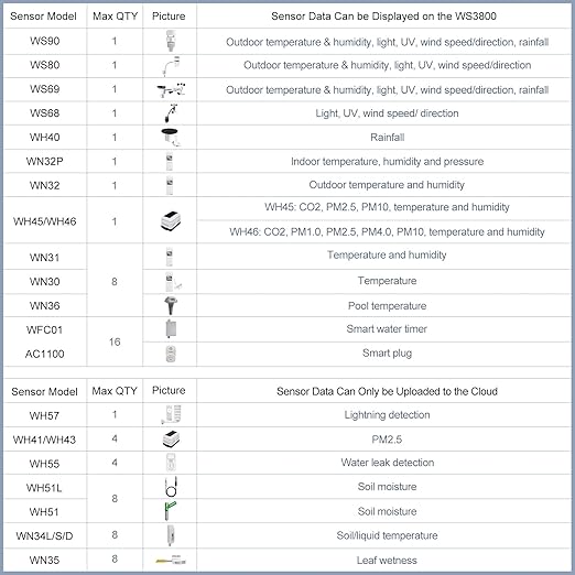 - 【Sensor Data Can be Displayed on the WS3900】Except the WS90, the WS3900 display console can pair with 1 × WS80, 1 × WS69, 1 × WS68, 1 × WH40 rain gauge sensor, 1 × WN32/WN32P sensor, 1 × WH45/WH46 air quality sensor, 8 × WN31/WN30/WN36 sensors, 1 × WH57 lightning detector sensor, 4 × WH41/WH43 PM2.5 detector sensors, 4 × WH55 water leak detector sensors, 8 × WH51/WH51L soil moisture sensors, 8 × WN34L/WN34D/WN34S sensors, 16 × IoT Devices,such as WFC01 watering timer and AC1100 smart outlet. (Except WS90, other sensors are sold separately.)
