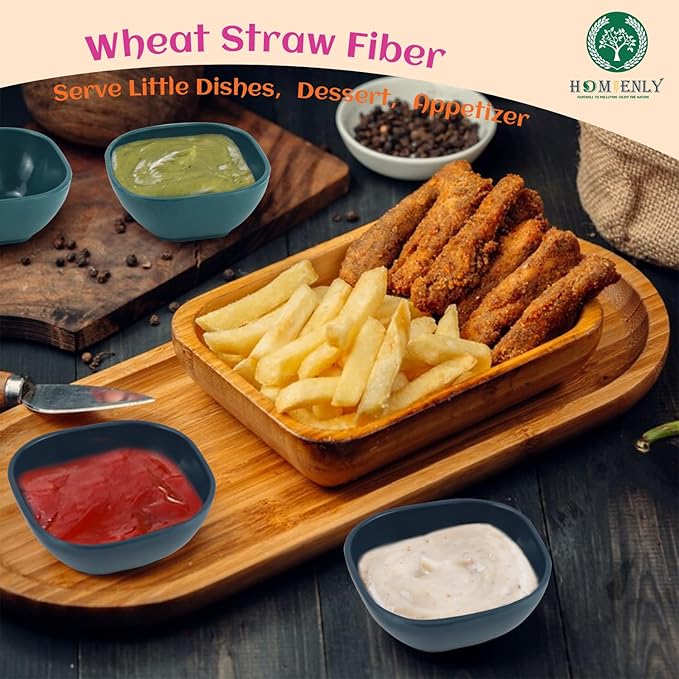 - SOY SAUCE DISHES: 4.5 oz wheat straw dip bowls, perfect for individual portion serving, such as ketchup for dipping chip, butter for dripping shrimp, chutney, and olive oil. And they are able to serve little dishes, dessert, appetizer and so on.