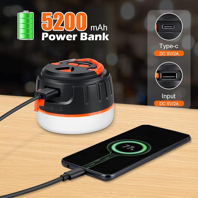 - ✅【5200mAh Capacity Battery】Rechargeable Camping light is equipped with a high-quality 5200mAh battery, This Led lantern not only provides reliable illumination but also serves as a convenient emergency power supply for charging mobile devices, providing up to 150 hours of low-brightness illumination for extended outdoor adventures.