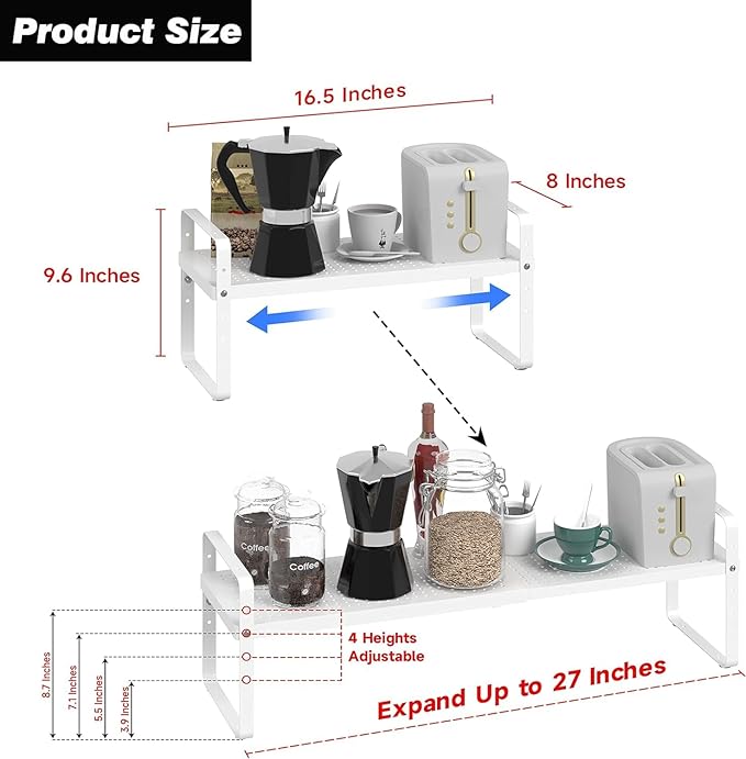 - EXTANDABLE KITCHEN COUNTERTOP ORGANIZER : This is a very flexible countertop organizer rack, and its height and length can be adjusted according to your needs. The size before expansion is 16.5 "L x 8" W x 9.6" H, the length of the shelf organizer can be stretched from 16.5 inches to 27 inches.
