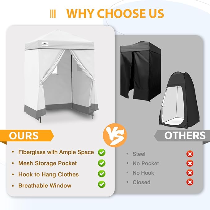 - INSTANT PRIVACY CHANGING ROOM: 5x5 changing tent for one or two people. Perfect as a changing room or sun cabana for outdoor activities: fashion show, photoshoot, camping, backyards, pool party or a showering tent, portable toilet shelter .