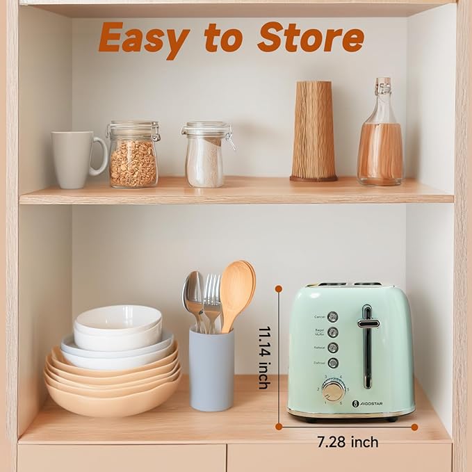 - Quick and Convenient: The slot size of the retro 2 slice toaster is 1.6 inches wide and 5.5 inches in length, it can accommodate thick and thin bagels, muffins, bread, sourdough, tortillas and other types of bread. It consistently browns your bread evenly and perfectly for both sides, top to bottom