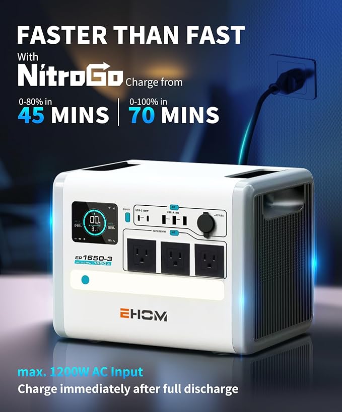 EHOM Portable Power Station, EP1650 1024Wh LiFePO4 EVE Battery Solar Generator Backup 120V AC/DC/USB, 1650W (Peak 2200W) Mobile Power Supply as Emergency Generator for RV Off-Grid Home Outdoor Camping