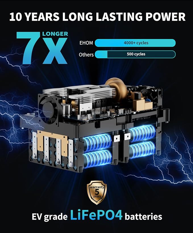 - 【Multi-Role & Durable】Whether at home or camping or as a backup power source, the portable EHOM powerstation meets your power needs, has a long lifespan, can charge and discharge up to 4000 life cycles, is easy to use and easy to store and is suitable for home or travel. *4000-cycle lifespan means that after 4000 complete charge and discharge cycles, the remaining capacity of the battery is still over 80%