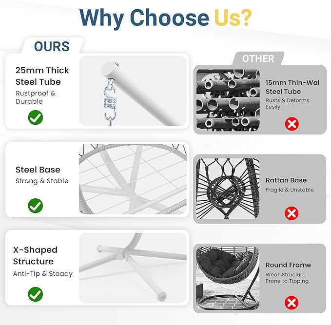 - Exceptional Support: We're committed to delivering top-notch products. If you have any inquiries about the RoyalCraft hanging egg chair, feel free to reach out to us right away. We're here to assist you promptly, address all your concerns, and ensure you have a satisfying patio furniture buying experience.