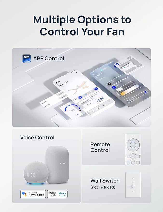 - Smart Ceiling Fan Experience: The DREO app, along with Amazon and Google Home voice command compatibility, allow convenient control of your ceiling fan. It enables setting schedules, adjusting lighting, fan settings, timers, and more.