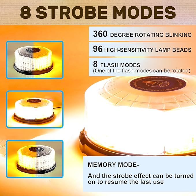 - 【Super Bright Beacon Light】Magnetic beacon light use 96 high intensity LED chips,360° full-coverage rotating design, clear shell has excellent visibility and safety, emit high brightness caution lights. The rooftop amber strobe lights are clearly visibleto ensure your driving safety in rain and snow and other low visibility conditions.