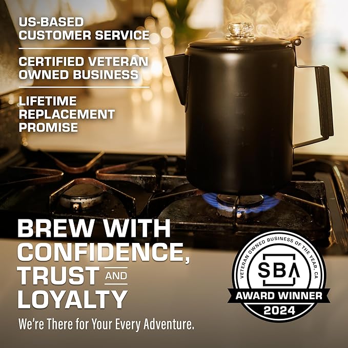- PROTECTIVE BLACK COATING — We coated an already sturdy & durable percolator to make our sleekest looking coffee maker yet. Brew in style and make your bold camping coffee in something really cool lookin’.