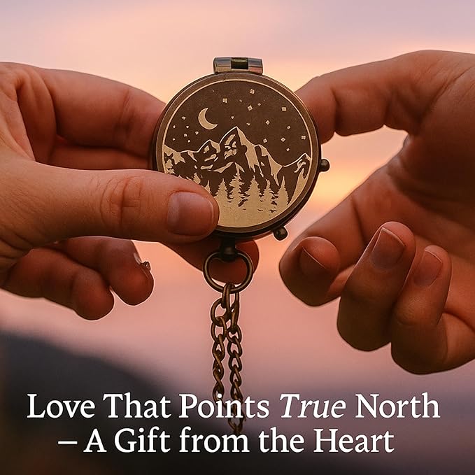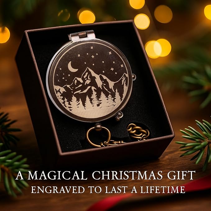 - 【Moon & Stars Engraved Pocket Compass】Vintage brass compass with mountain, moon, and stars engraving — a meaningful keepsake for men who love hiking, travel, and exploration. Perfect for husband, dad, son, or boyfriend