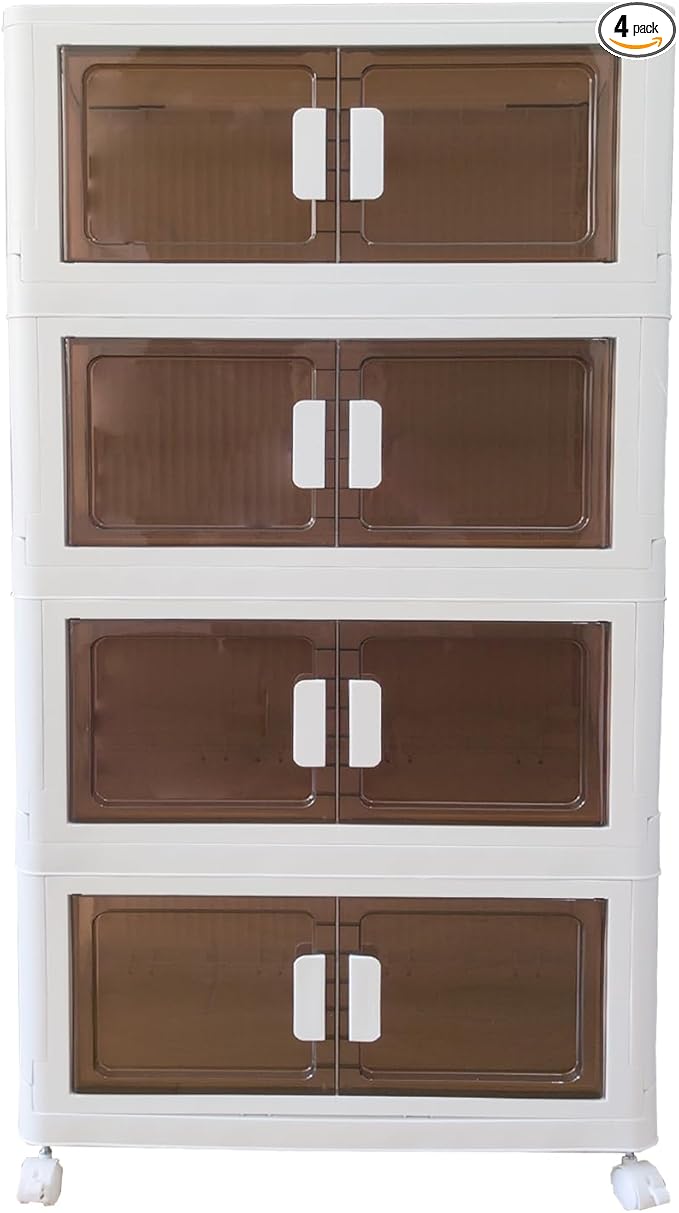64 Gallons Storage Bins with Lids - Folding Storage box with Doors and Wheels, Collapsible Plastic Storage Bins for Closets, Stackable Storage Organizer (Large-4Tier)