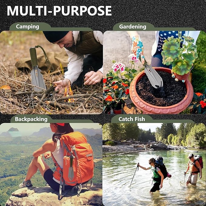 - Multi-purpose - Our lightweight hiking shovel can be DIY, insert a long stick at the end to increase the length, and can be used to spear fish in the wild. Great for outdoor camping, garden planting, wilderness survival, beach catching,backpacking, hiking and more.