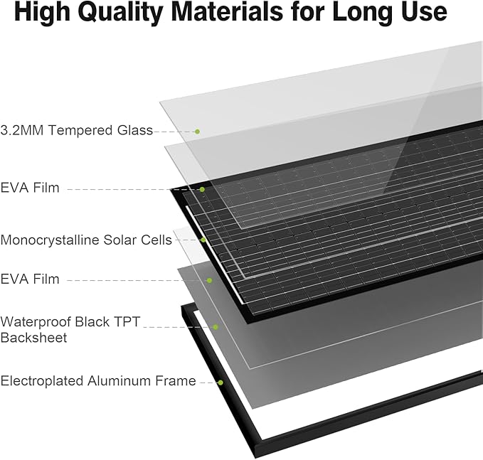 - 【365 Days Monocrystalline Silicon Solar Panel】With low-iron tempered glass, corrosion-resistant aluminum frame and IP67 waterproof rating, these panels can withstand decades of extreme conditions such as snow, rain and high temperatures. Tested to withstand strong winds (2400Pa) and heavy snow (5400Pa), provides reliable performance in any climate, perfect for residential, commercial or off-grid use.