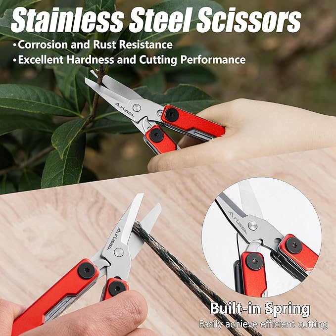 - Stainless Steel Scissors: FLISSA small multitool is made of high-quality stainless steel with excellent hardness, cutting performance, wear and corrosion resistance. Whether indoors or outdoors, the scissors stay sharp and reliable for various cutting tasks