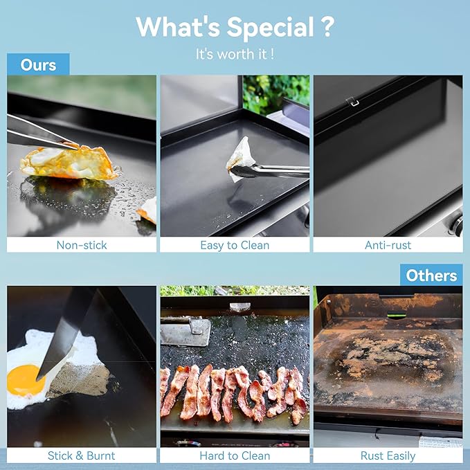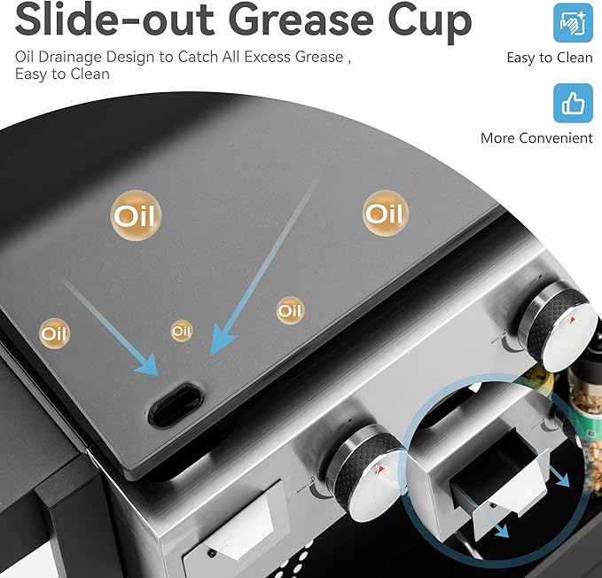 - EASY TO CLEAN: "Cooking made simple, cleanup made effortless." Our propane griddle station boasts easy-clean design with an oil drip hole and a slide-out grease cup, ensuring you spend less time cleaning and more time enjoy the outdoors and the fun time