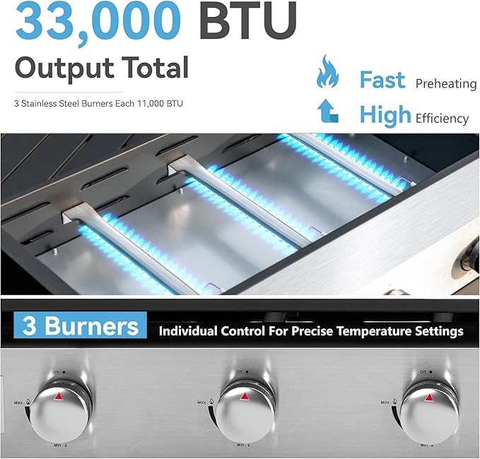 - FAST HEATING: Three separately controlled burners offer an overall of 33,000 BTU cooking power. 3 independently adjustable heat zones also allowing the option to keep certain foods warm while others cook