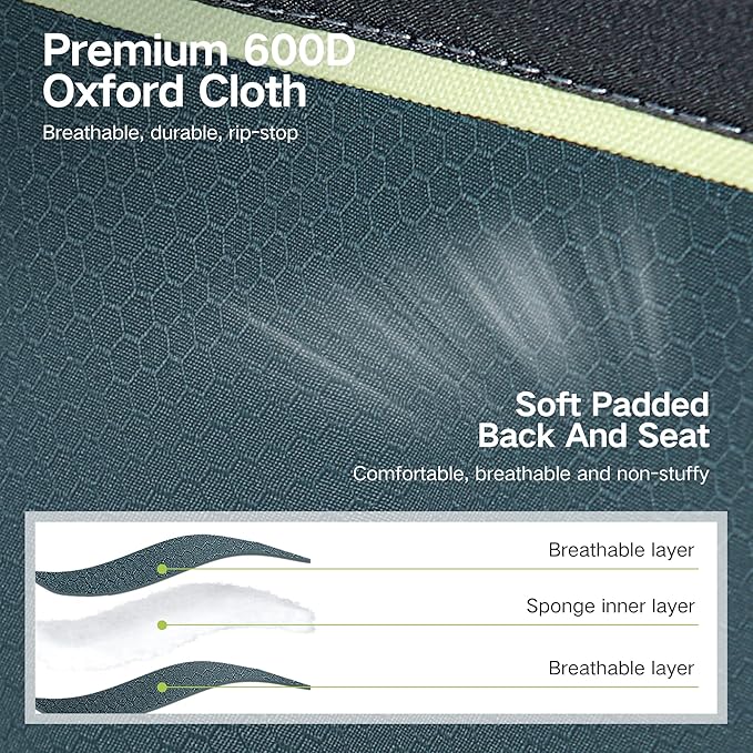 - 【CAMPING CHAIR With Premium 600D OXFORD FABRIC】 The lawn chair with ergonomic padded back, seat and armrest provide max comfort for your body. The durable double-layer 600D padded breathable oxford fabric with powder-coated steel tube frame enables you deserve a comfortable and safe chair.