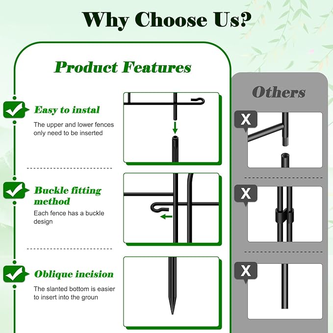 - 【Rustproof and Tough】:Black rustproof coated decorative garden fence is welded with steel wire, strong and durable. and stiffener design enhances stability is not easy to bend, ensures they won't break when inserted into the ground, Fences can withstand any weather conditions and is built to last for years.