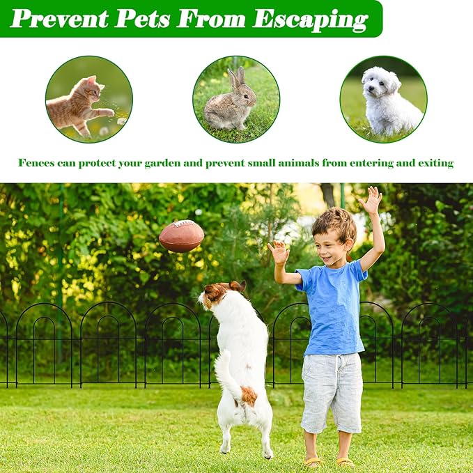 - 【Perfect Size】: Each metal fence panel is 24.5" high and 12.2" wide, fencing rod clearance of 3", 10 panels in total, with a total length of about 10ft.The classic arched design adds a modern touch to your garden, backyard, front yard, patio or yard.