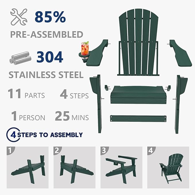 Folding Adirondack Chair, SGS Tested, Wooden Textured with Cup Holder, Heavy All-Weather HDPE Comfortable Set Poolside Backyard Lawn Green