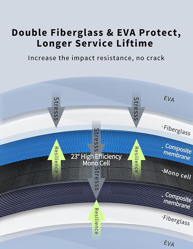 - Waterproof and Dustproof - The solar panel is an IP68 Waterproof that effectively protects against water splashes and dust, ensuring reliable outdoor performance. It is more durable than traditional glass and aluminum panels and features built-in bypass diodes for enhanced performance.