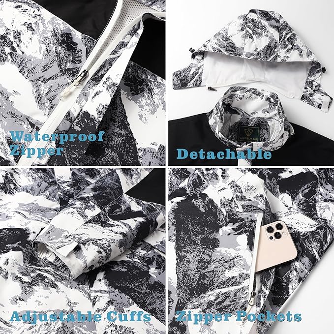 - [Adjustable Highlights]: The hood of this men's waterproof jacket hoodie is detachable and the hood has stretch straps to fit various environmental needs. Detachable hood provides different ways of wearing. The sleeves have adjustable cuffs, which can against the cold wind and make it easy to adjust the length of the sleeves.