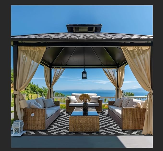- Extended Lifespan · Dual-Sided Wear Resistance: The GENIMO outdoor rug features a reversible design with two classic geometric patterns, doubling its lifespan through alternating use. The dark-toned surface effectively conceals dirt, stains, and fall debris, maintaining a pristine appearance even in rugged environments. Perfect outdoor patio rugs, RV mats, and camping rugs for indoor-outdoor transition zones—effortlessly switch sides for practicality and timeless decor.