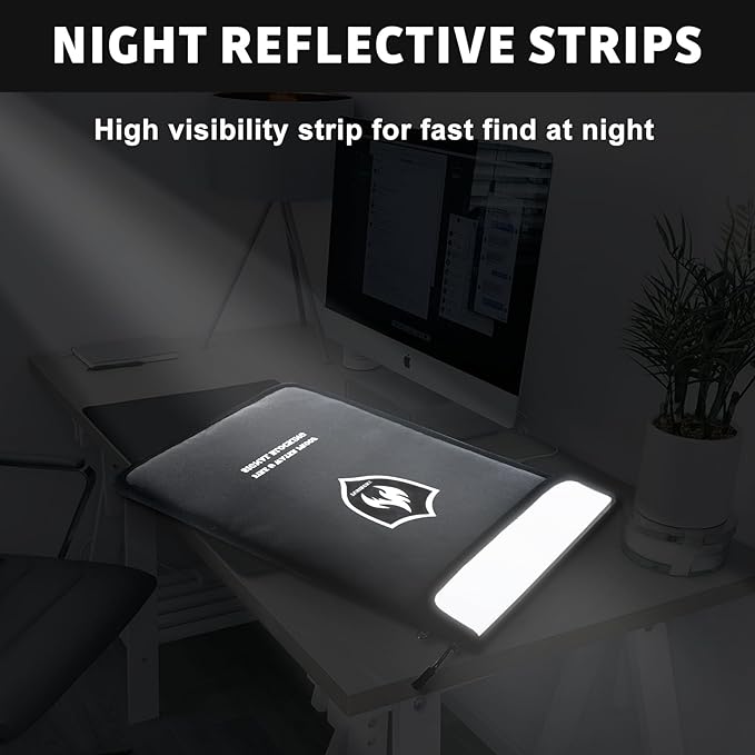 - Reflective Strip For Fast Evacuation At Night: Unique reflective strip design, even at night, you can find your fire safe bag immediately. Saving every second counts in a fire, the reflective strip points you in the right direction for fireproof envelope