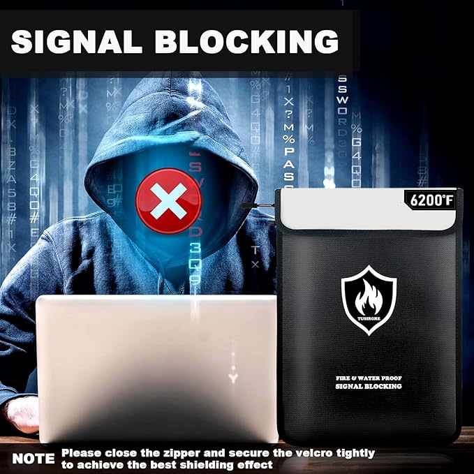 - Tips: If the fireproof safe pouch is not completely closed, it will affect the shielding effect, pls close the zipper and secure the velcro tightly to achieve the best shielding efect; Cannot Be Forcefully Folded Or Rubbed For A Long Time
