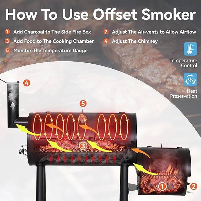 - OFFSET BARREL SMOKER: With a horizontal cooking chamber and a firebox on the side, this smoker grill is fueled by charcoal and flavored by hardwood splits & chunks to cook with indirect heat for low and slow barbecue flavor