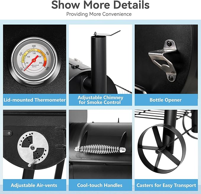 - 2 IN 1 SMOKER & CHARCOAL GRILL COMBO: Designed for use as either a traditional offset smoker or a charcoal grill. We provide charcoal grates for the main chamber and grilling grates for the side firebox. This allows the large smoker to be easily converted into a large charcoal grill