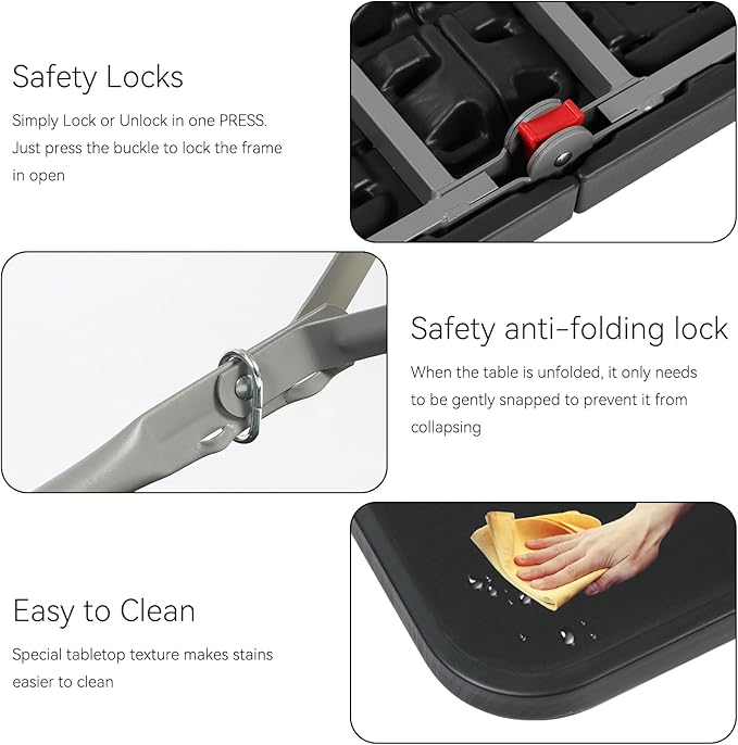 - Foldable and Portable Design: The ONUUNPY 6-foot plastic folding table can be conveniently folded in half and secured with a safety buckle. It features a comfortable handle for easy carrying, making it ideal for storing in your car trunk and perfect for picnics and outings with friends.