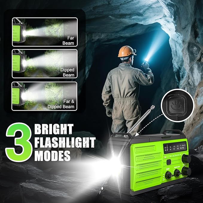 - Versatile Emergency Lighting & SOS Alert: Our crank radio offers 3 modes flashlight, reading lamp, and SOS alert. During nighttime movements or power outages, this flashlight offers 3 different lighting modes to enhance visibility. The adjustable reading lamp offers clear lighting for reading or detailed work. In emergencies, the loud SOS alert can draw the attention of rescuers. This emergency weather radio ensures you have the capabilities to confidently handle unexpected situations