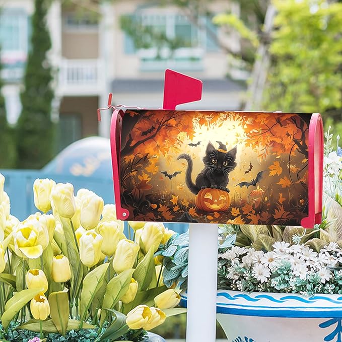 - 🎃Standard Size: Designed to fit standard mailboxes, this Halloween cat cover measures 21x18 inches. The magnetic backing ensures a secure and easy installation, making it a perfect fit for most mailboxes without any hassle.
