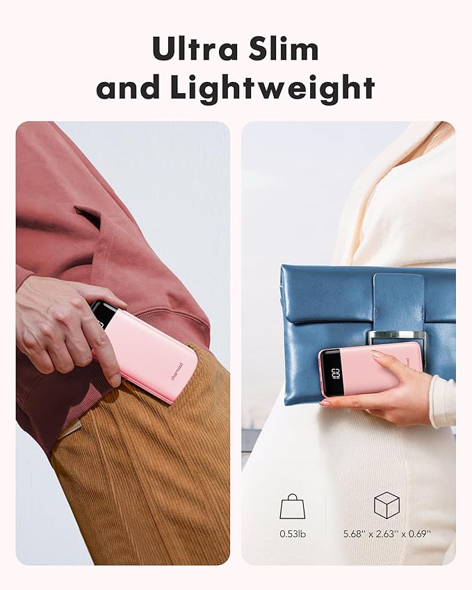 - 【Your Daily Power Hero: From Desk to Dinner】Slim enough to slip into any pocket or small bag, yet powerful enough to rescue your day. Whether you're grinding at work, catching up with friends, or on a weekend adventure, this power bank ensures your devices stay alive when you need them most. Never miss a moment!