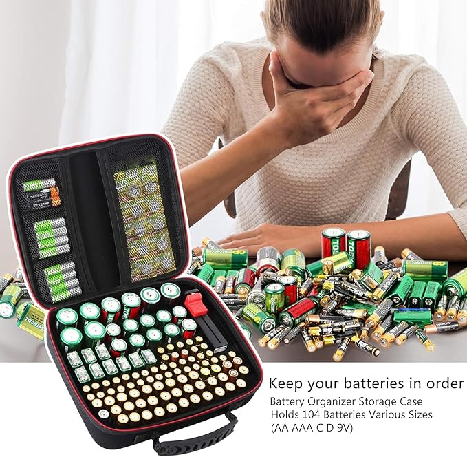 - 【For More Type Batteries-holds 104 +】 - This versatile battery container holds all types, including AA, AAA, C, D, 9V, and button cells. Organize your batteries neatly in one caddy, ensuring you always have the right ones on hand when you need them.(Not includes Batteries)